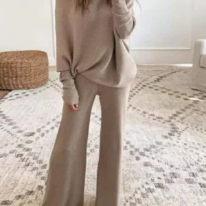 Fashion Long-sleeved Bateau Collar Top + Wide-leg Pants 2-piece Set Women Elegant Autumn Solid Color Knitted Loose Suit Female