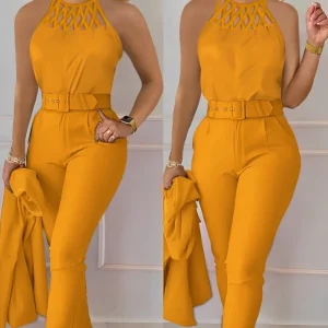 Two Piece Set Women Outfit 2024 Summer Fashion Hollow Out Round Neck Sleeveless Tank Top & Casual Pocket Daily Pants Set